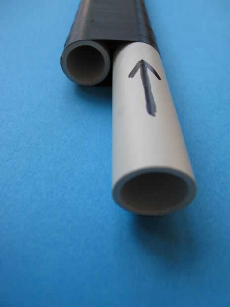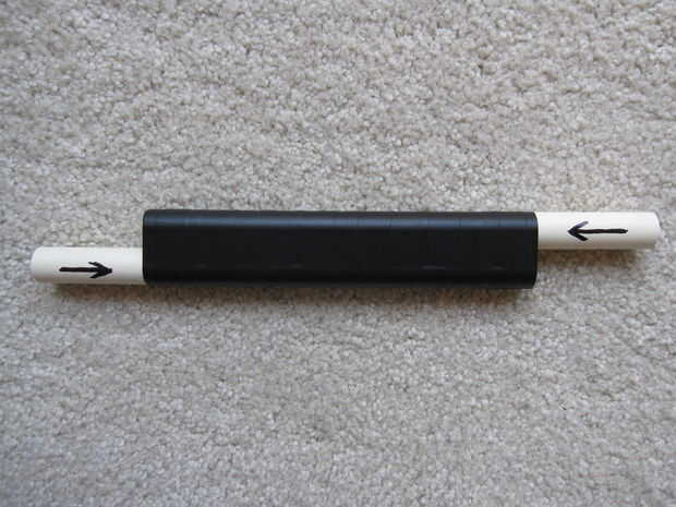 Además, configuraciones como se muestra en el cuadro 4 se pueden utilizar con los acopladores. Se trata de un simple flip-en barril, de pegar dos barriles. Envuelve este barril alrededor de la tapa con cinta aislante para que se vea más limpia. Las flechas en los cañones indican donde el cañón se enfrenta cuando está insertado en el acoplador. Fotos 4, 5 y 6 demuestran el barril alrededor de flip.