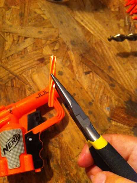 Usar sus alicates de punta larga para sacar una barra de plástico en el cañón de la pistola.