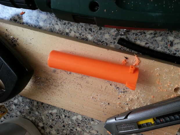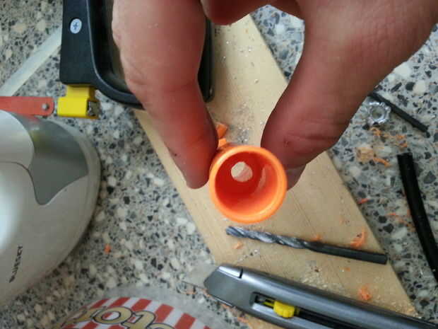 hacer un agujero de aspecto agradable (no como el mío en la fotografía, que fue mi primer hoyo en esta nerf y utilicé brocas de metal en vez de madera) de 10 mm por el interior pared. esta parte debe parecerse casi un cilindro simple ahora.