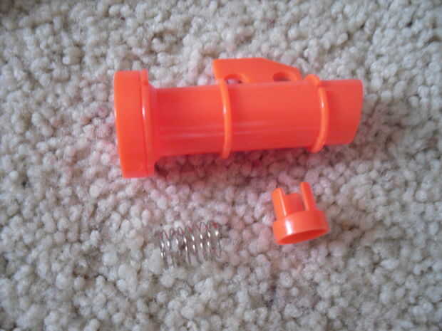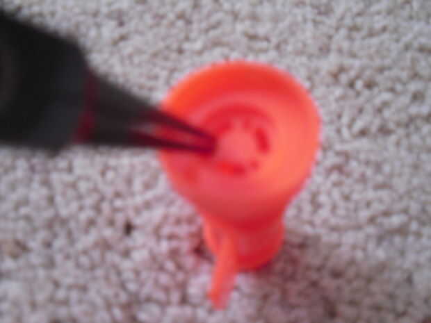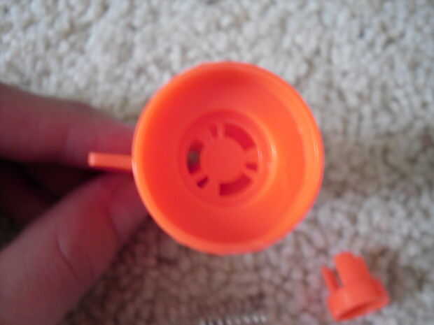 Que la parte superior parte y mira abajo, debe haber un pedazo de algún bloqueo de su vista. Estas son las restricciones de aire. GRRRR... todo el mundo odia a ellos. Ahora sólo bash lo con un destornillador para el contenido de su corazón! (o hasta que se elimine completamente.:).) Ahora pegue ese pack de bugger en el barril y BAM! Eres hecho modding el barril.