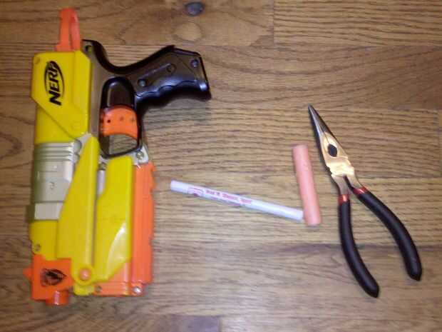 un tubo de bolígrafo BIC desmantelado un dardo nerf menos el velcro, émbolo, silbato, etc.. un interruptor de nerf disparo EX3 (probablemente funcionará con cualquier arma de carga frontal) y un par de alicates de punta