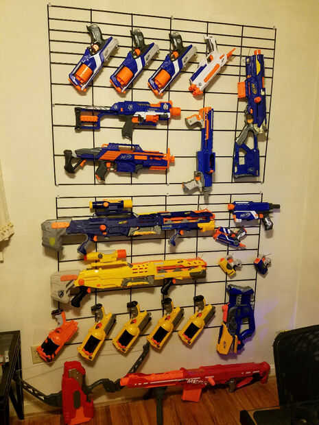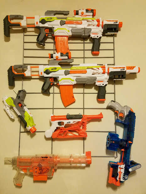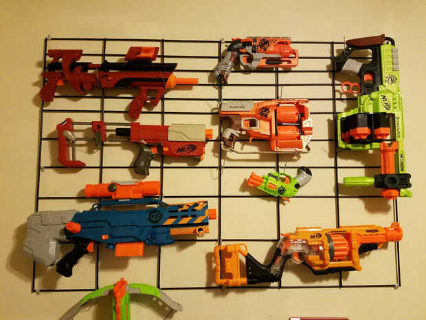 Ahora Saque todas sus armas de Airsoft, armas de Nerf, espadas de espuma, picos de Minecraft y todo lo que quieres colgar y comenzar a agregar. Algunos clips de tracción alta tendrá que doblarse para hacer para ciertos ángulos.