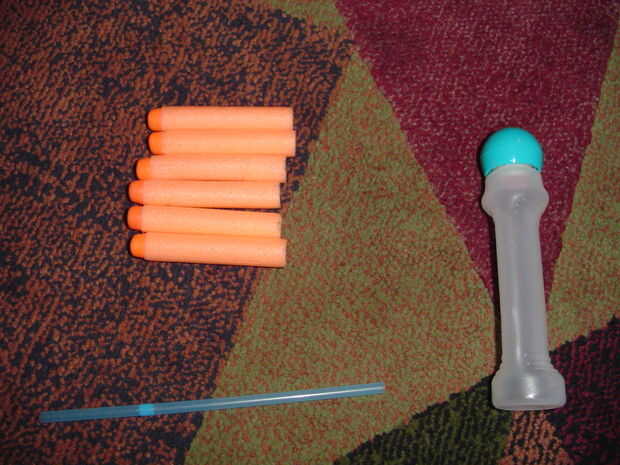Paso 1: fuentes de NecesitaPistola Nerf--Unos 8 en de hilo-Tijeras-Tac pulgar (Similar a la de la foto)-Nerf bala (puedes usar los que pegan a plasticky cosas demasiado pero estoy usando el que está en la foto)Paso 2: Sacar la tapa de goma Cortar la