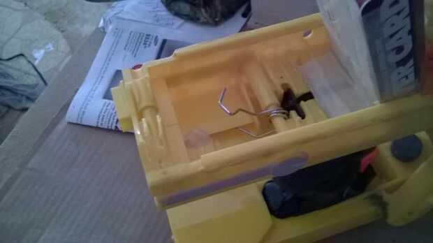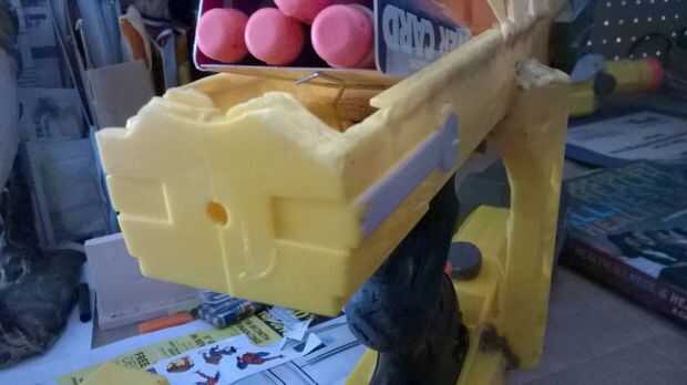¿Cómo es que dices? obtener la dremel y cortar el extremo del tornillo para que apenas toque la caja (en cada lado). O, calor al final del clip de papel y ejecutar a través del lado de la pistola, pasando por la parte inferior de la caja y al otro lado (pero no hasta el final: no tienes que).