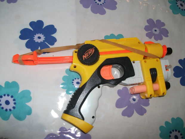 en este Instructable te enseñaré cómo hacer un simple mod a tu revolver nerf que es muy sencillo. Por favor, no seas dura porque este es mi primer instructable. Disfrutar.Paso 1: Los suministros -una arma de nerf amarillo-una pistola de nerf azul-die