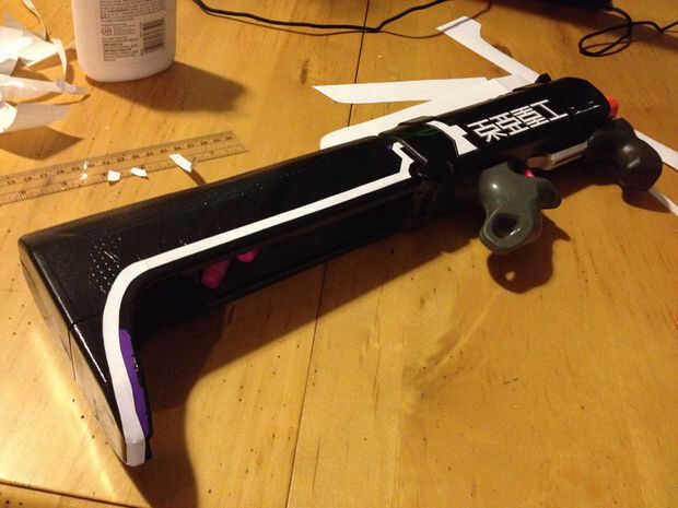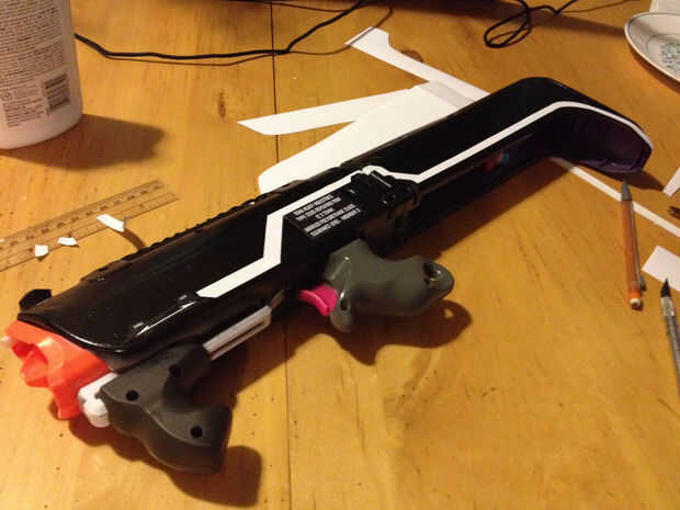 Aún parecía demasiado llano y forma demasiado oscuro y yo todavía quería rayas. En lugar de atornillar con la cinta algunos más, me cortar papel etiqueta llano y funcionó a lo largo de algunas de las características. No tienen las mejores juntas o las anchuras más consistentes, pero era lo suficientemente bueno. También he añadido algunas etiquetas a las diversas manijas y botones, como se puede ver en un arma real.