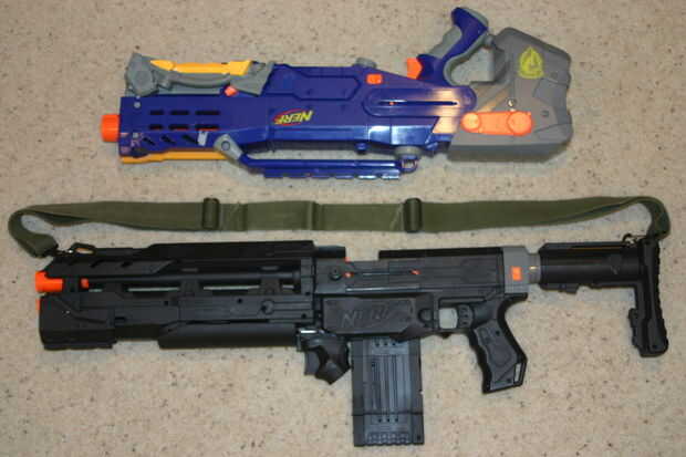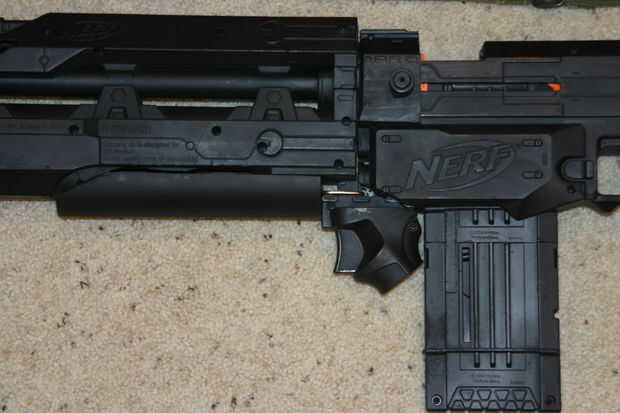 Lo 2 º fue encubrir la captura de gatillo y dando al usuario un lugar para descansar su mano y no obstaculizar la captura de gatillo. Tomé un pedazo de 2 pulgadas PVC, corte a la longitud correcta y cortar por la mitad. Pegué en el lado derecho de la pistola utilizando una soldadura fría.