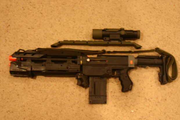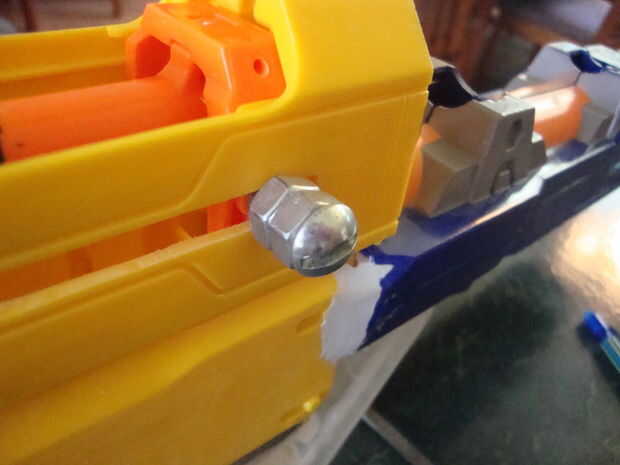 La última foto del riel demuestra que todavía tiene la parte posterior del carril todavía en él. Me lo quité y había pegado de la pieza frontal en la parte posterior. Así que el carril se compone de 2 carriles de longshot menos parte posterior donde puede conectar una correa. También noté que el tren era fuerte así que cortar algunas espigas de metal y utilizado bondo para mantenerlos en y sobre todos hacer el carril más fuerte.
