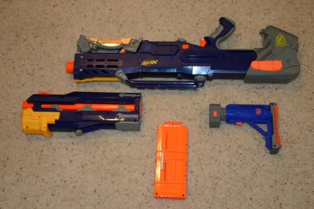 Las piezas de la pistola (de armas de nerf stock) son una Recon, stock de Raider, Longshot frontgun, longshot, Vulcan y trenes 2 clips.