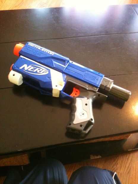 se ha hecho para el reconocimiento, pero no para el Retaliator - hasta ahora MUHAHAHA!Paso 1: Materialz Se necesita:Nerf RetaliatorBarril de Nerf LongstrikeStock de Nerf RaiderPaso 2: La ruptura Tomar todos los accesorios de la Retaliator.Paso 3: Att