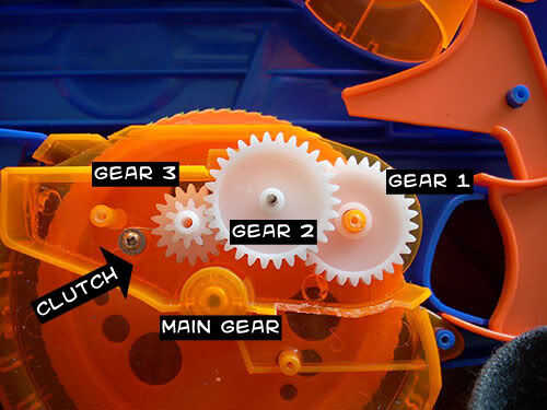 Cuando usted tire hacia atrás la manivela, los dientes en la parte inferior captura en marcha uno. Engranaje una gira engranaje dos, y la fuerza de giro del engranaje dos fuerzas engranaje tres hacia abajo para enganchar el engranaje principal que gira directamente el volante, que es lo que propulsa las bolas fuera de la pistola. Cuando deje de tirar, un pequeño resorte empuja tres engranajes fuera de contacto con el engranaje impulsor, actúa como un embrague y que le permite a la bomba hacia adelante y hacia atrás mientras que el volante gira solo una forma de. Bastante dulce.