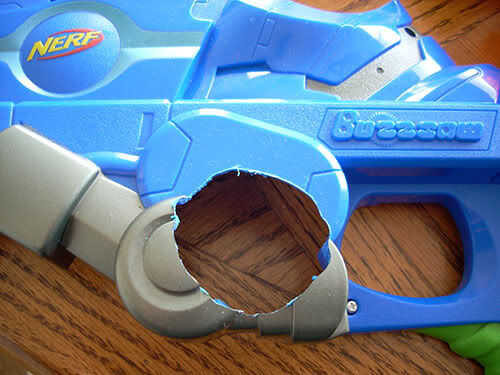 A continuación, tienes que cortar un todo en el caso de exterior para acomodar el motor. Usé una dremel para esto. Dremels son invaluables. Se deben ir a comprar uno ahora mismo. Ver imagen 5. A continuación atornillar la carcasa hacia atrás.