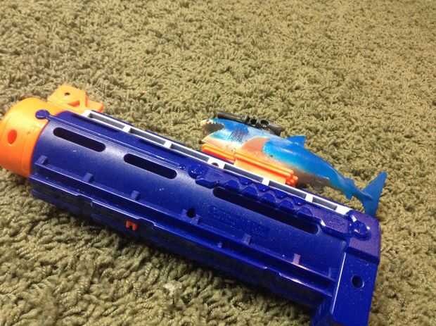 He modificado una Blastzooka extrema BuzzBee para disparar 6 Nerf dardos elite, estilo de la escopeta. Inicialmente lo hizo disparar dardos solo, pero era demasiado poderoso como para dejar que mis hijos utilizan. Deja ronchas en su cuerpo y también