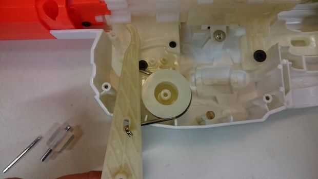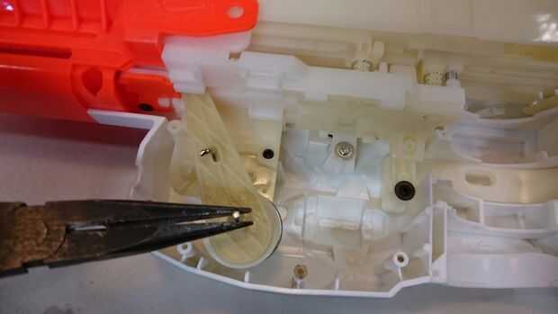 aparte tomé mi pistola de nerf del disco y cambió la posición del resorte de modo que sería más pretentioned y así tener más fuerza.el pic. demostraciones necesitan herramientasPaso 1: primero sacar el tornillos se muestrala caja negra al lado de la