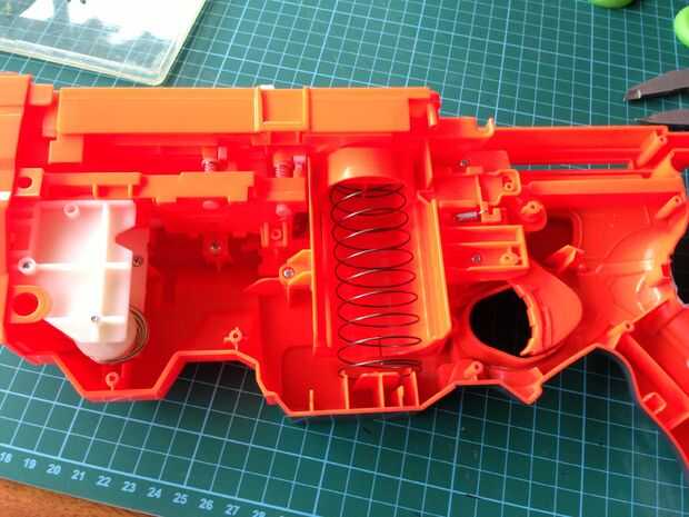 desmontadas mi nerf stampede mientras que en la actualidad en una pintura y construir mod para mi longshot. He aprendido a quitar el restrictor de aire, permitiendo así más energía. Aunque es considerada compleja por ser totalmente automático, el dis
