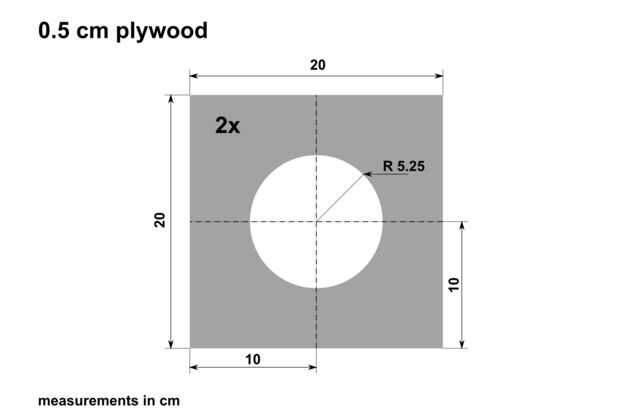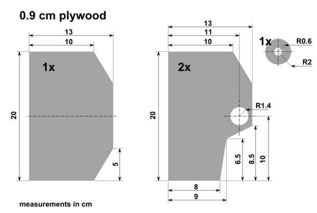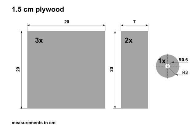 • bloque rectangular 20 x 40 x 45 mm y 20 x 40 x 128 mm de madera (también se puede utilizar el contrachapado de 1,5 mm)