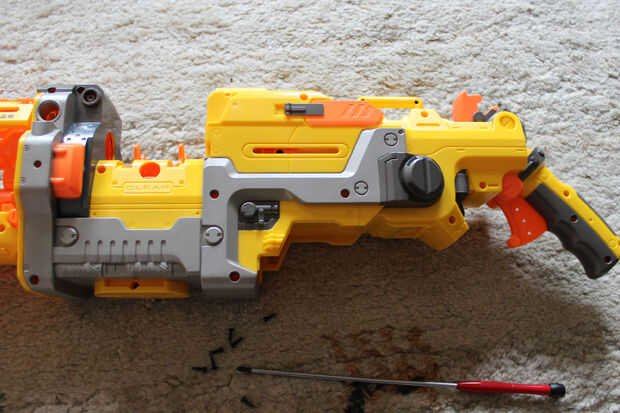 este es un instructivo para eliminar el ruido de chasquidos en una Nerf Vulcan EBF-25 de trípode (obviamente)???. Su muy irritante la Nerf Vulcan EBF-25 de trípode hace clic cada vez que lo giras un poco, que dirá a la gente donde estás durante una g