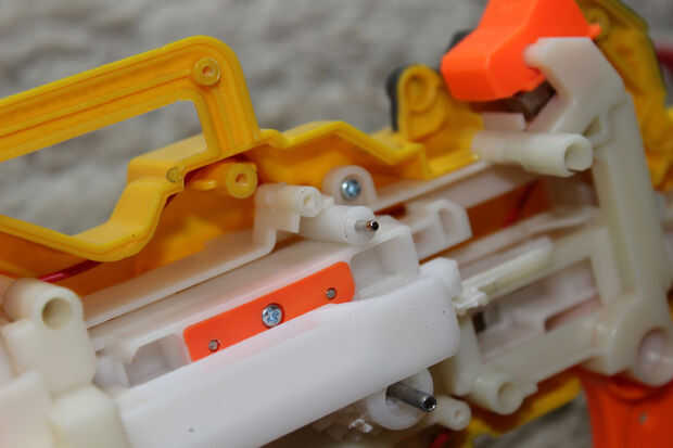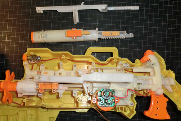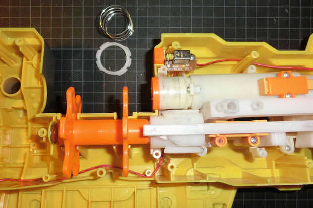 En la última foto se puede ver cómo mejora la velocidad de disparo. Para darle una idea de la velocidad de la pistola después de la sustitución - es aproximadamente tan rápido como un Nerf Maverick sin modificar (por lo que es más divertido, pero no peligroso).