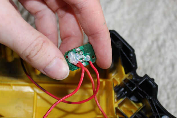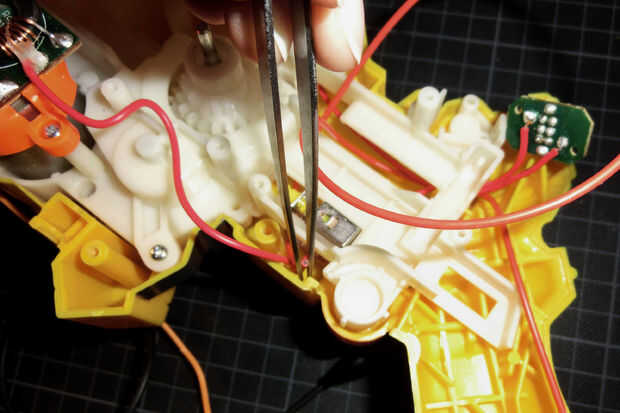 Desenroscar el mecanismo, o alicate para colocar el cable por debajo de él, como se muestra en la tercera foto. Ahora todo lo que queda por hacer es asegurar los cables con pegamento caliente, como se muestra en la cuarta foto de este paso. Simplemente conecté los dos cables; Pero también se puede añadir un interruptor, para también permitir disparar apretando el gatillo.