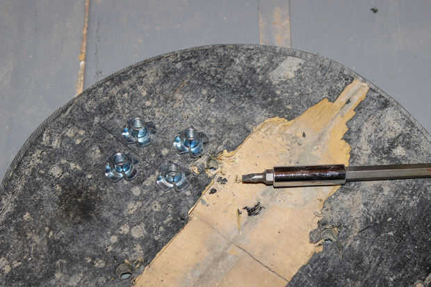 Ahora tienes que cortar un agujero en cada uno de la madera contrachapada de 0,5 cm o placas de MDF, para montar el rodamiento de bolas axial (echar un vistazo en el paso 1 para las medidas). Pegar uno a la placa con el servo y el otro a la tercera placa. Perfore un agujero en el centro de la tercer plat, que tiene que ser lo suficientemente grande como para permitirle atornille bien el brazo del servo el servo.
