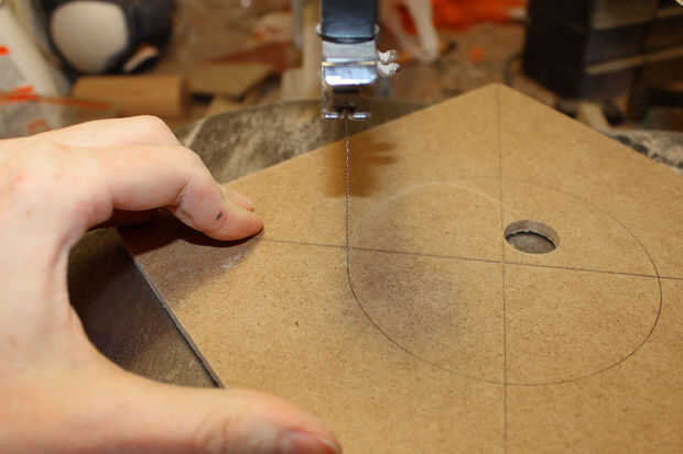 Corte una ranura en la otra 20x20x1.5 cm placa de madera contrachapada, para ajustar el servo. Asegúrese de que el eje esté perfectamente centrado!