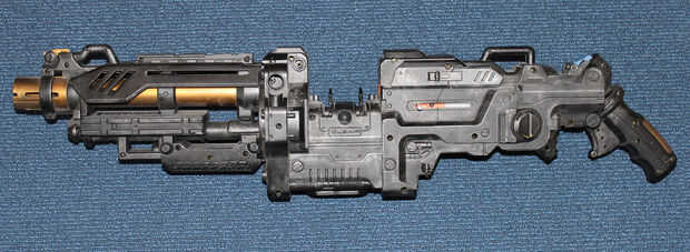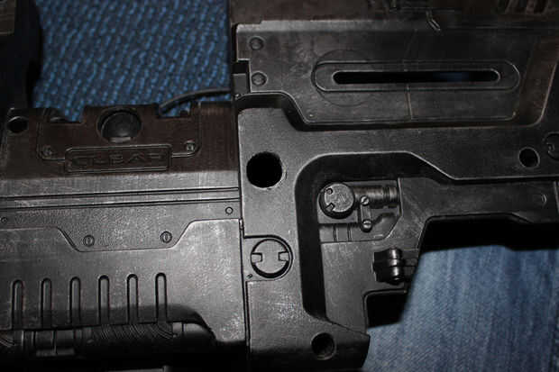Decidí que la mejor manera de fijar el poste de madera sería a través de un orificio de tornillo existente. Puesto que el arma debe sujetarse en su centro de gravedad, que tuve que usar contrapesos más adelante (no quiero sacar la parte delantera de la pistola, ya que pensé que se veía bien). De lo contrario el centro de gravedad interfiere con la correa de la munición.