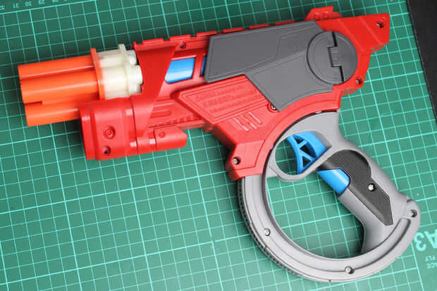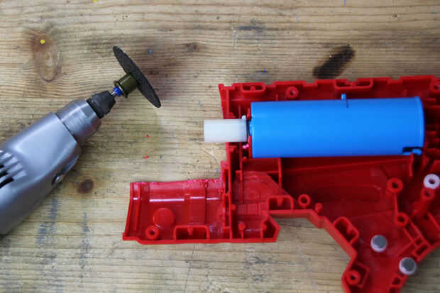 Luego deberás cortar un agujero en la cáscara, como se muestra en el cuarto y el quinto cuadro, para caber el nuevo mecanismo en la Whipblast. Te sugiero que utilices las piezas "case1.stl" y "case2.stl" del siguiente paso para saber donde hacer el corte. Utilicé un disco de corte de la velocidad de Dremel y funcionó muy bien.
