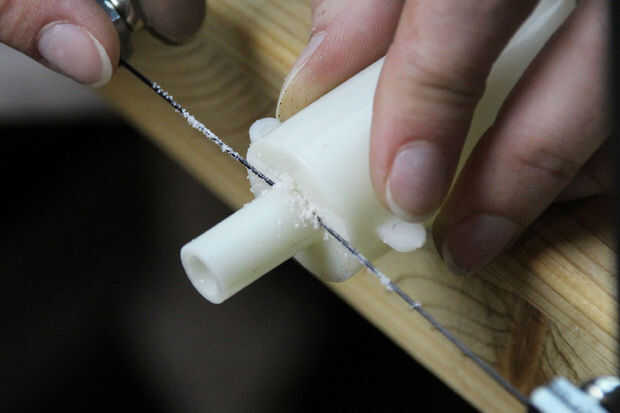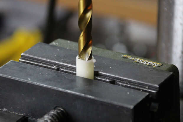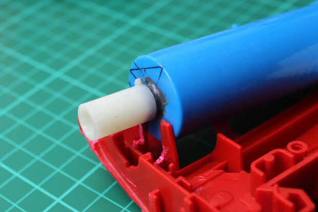 Primero use una sierra para cortar la parte delantera del émbolo de la pistola cohete mapache, como se muestra en la primera foto. Puesto que la apertura es un poco demasiado pequeña tendrá que ensanchar el agujero. Luego pégalo al émbolo de la Whipblast como se muestra en la tercera foto.