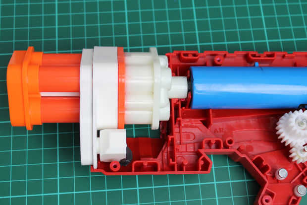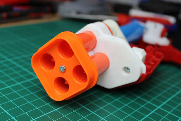 Perfore un pequeño agujero en el centro de la pieza naranja que sostiene los barriles en el lugar, por lo que puede ser atornillado a la pieza "front1.stl".