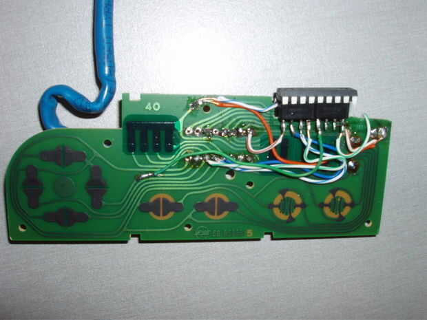 El cableado del controlador es muy sencillo en teoría, pero es complicado por el uso de todos los componentes originales (las líneas negras cubrieron con verde cinta transparente son, de hecho, resistencias pull-up).