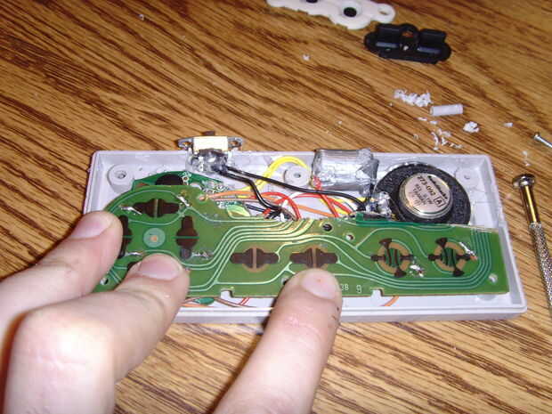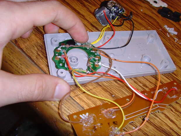 Ahora viene la parte delicada - guarnición dentro de esa pequeña caja. Tómese su tiempo, canalizar sus conocimientos de origami y embalar las tarjetas allí. Encontré el llavero cabe Junta mejor justo detrás el D-pad en un ligero ángulo (ver fotos) después de eso, sólo los cables alrededor de la serpiente y montar el tablero de regulador en la parte superior. En el otro lado de la caja, realmente caliente pegué los conectores del botón en su lugar. Esto no es necesario, pero hizo a montaje mucho más fácil y me imagino que facilitará cambiar baterías así. También asegúrese de ponerse las pilas!