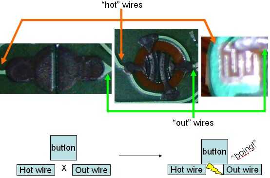 Desde dos circuitos de trabajan en el mismo principio (usando botones conductivos para completar circuitos), podemos utilizar una tabla para operar el otro. Todo lo que tenemos que hacer es soldar las conexiones entre el cable vivo y los cables de salida para cada botón. (ver foto) Luego cuando se presiona un botón en el controlador, el llavero es circunvalado y el botón del regulador completa el circuito y envía una señal al microchip en el tablero de llavero, creando un efecto de sonido. Todos los botones funcionan del mismo modo, por lo que cualquier sonido se puede conectar a cualquier botón.
