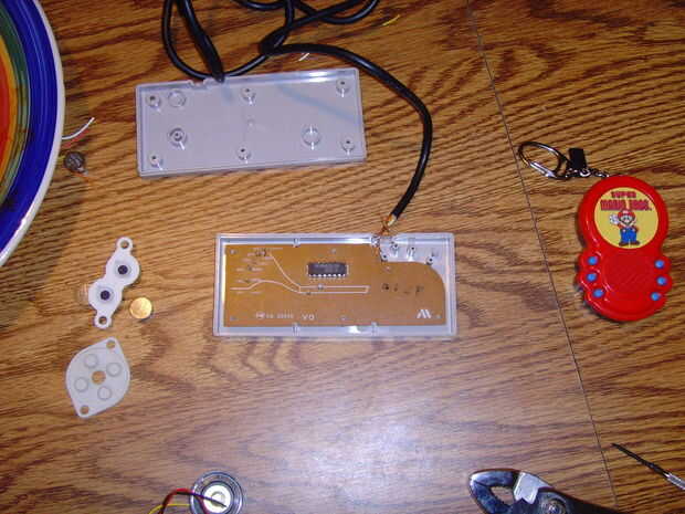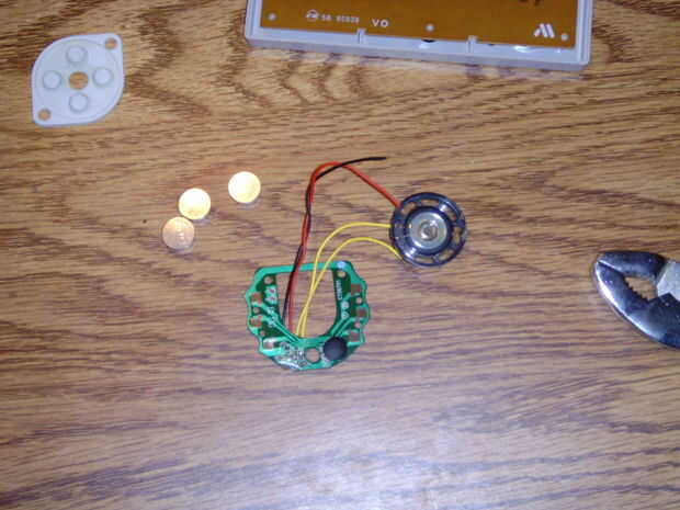 El llavero es un poco más complicado. Sacar los tornillos externos que la vivienda Junta y los dos tornillos pequeños que sujetan la placa de circuito en el lugar. Corte los cables rojos y negros a las baterías y luego saque el altavoz, que se celebra en el lugar con una pequeña cantidad de pegamento (con cuidado). Esto la placa de circuito debe liberar completamente. También rescatar las baterías y las conexiones de la batería de la llave. Las conexiones pueden ser quitadas por apalancándola interior cubierta y con un destornillador para apalancarlos gratis.