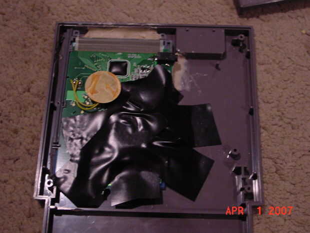Ahora, poner los botones, pantalla y Motherboard, Tarjeta madre en el lugar. Asegúrese de que alinee con los agujeros que se cortan. Pegue los bordes de la placa base y pantalla en su lugar. A continuación, la parte que me tomó un tiempo para averiguar cómo hacer... conseguir la batería. Parece clase de sucio, pero todo lo que hice era cinta de la batería en su lugar con cinta aislante.