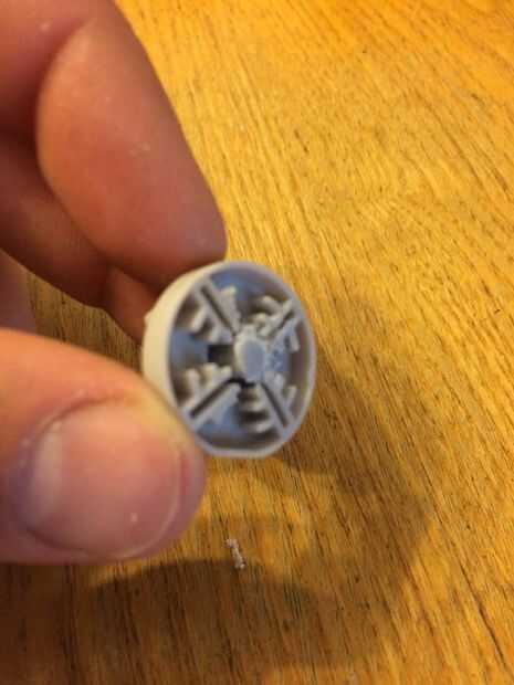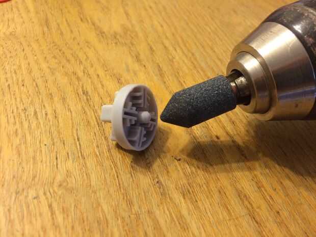 Ponte unas gafas de seguridad y coge la herramienta de perforación de rotary de la mano. Entonces afile el fulcro en la parte posterior del D-pad con la broca de pulido. Hay cuatro miembros de apoyo que también tendrá que ser hacia abajo. Hice mi mejor esfuerzo para eliminar la mayor parte de los miembros de soporte y el poste central y luego cambiar para papel de lija para el anillo externo. No lije apaga demasiado sin embargo, la idea es a la arena de lo suficiente para que la cicloide se encajarán a presión juntos alrededor del D-pad. Enjuagar cualquier polvo residual plástico y permita que el D-pad secar.