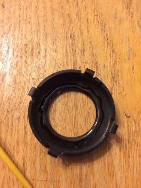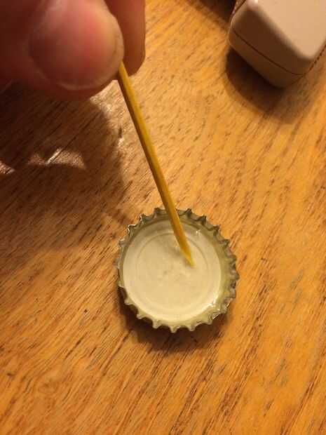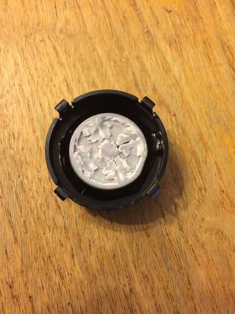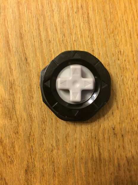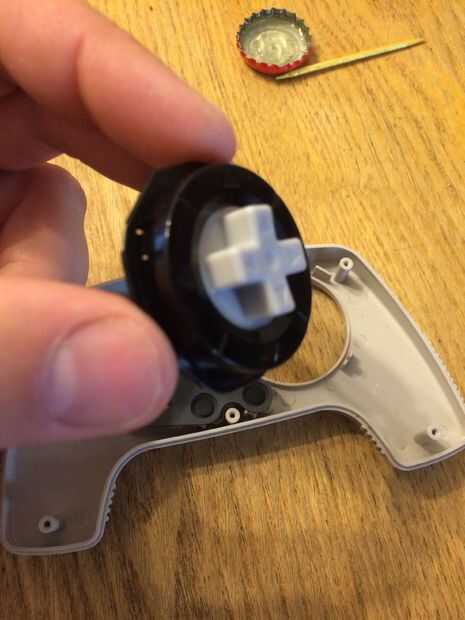 Exprimir una pequeña cantidad de la dos partes de epoxy en la tapa de la botella. Utilice un palillo para mezclar el epoxi. Entonces, usando el mismo palillo de dientes, aplicar una pequeña cantidad de epoxi alrededor del agujero en la parte posterior de la pieza frontal de la cicloide (véase cuadro 3). Luego coloque el D-pad en el agujero y centro, asegurándose de alinear las direcciones (arriba, abajo, izquierda, derecha) con los triángulos sobre la faz de la cicloide (véase cuadro 4). Vuelva la cicloide juntos para ayudar a mantener el D-pad en su lugar mientras que los sistemas de epoxy. Realizar ajustes finos en la posición del D-pad ahora antes de los sistemas de epoxy demasiado largo. Permita que el epoxi por 20 minutos y luego retire la parte posterior de la cicloide otra vez. Otro pequeños lotes de epoxi de la mezcla y aplicar alrededor de la base de D-pad (ver foto 5). Finalmente, se aplican algunos epoxy a la pieza posterior de la cicloide (ver foto 6) y vuelva a la cicloide. Permita que el epoxi cure durante 24 horas.