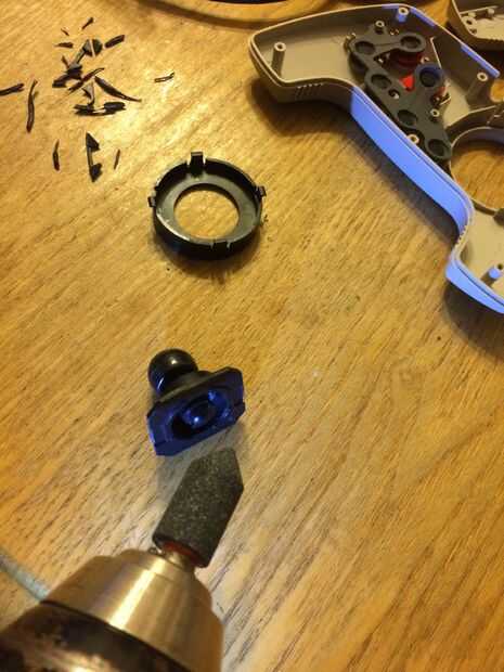 Con su seguridad gafas, utilice el taladro (o herramienta rotativa) y rectificado cónico poco a la rutina de lo fulcrum. Luego, continuar a moler (o arena) abajo los cuatro topes levantados hasta que la parte entera es al ras e incluso.