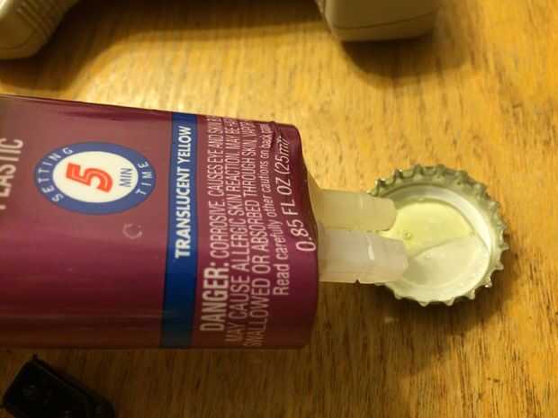 Pop la palanca de mando de la base del joystick. Luego exprimir una cantidad muy pequeña de la dos partes de epoxy en la tapa de la botella. Utilice un palillo para mezclar el epoxi. Luego, con el mismo palillo, aplique una pequeña cantidad de epoxi al agujero en la base del joystick. También se aplican algunos epoxy a la parte inferior de la palanca de mando. Vuelva a colocar la palanca de mando en la base del joystick y mantener en su lugar durante 3-5 minutos. Permita que el epoxi cure durante 24 horas y luego disfrute de su creación.