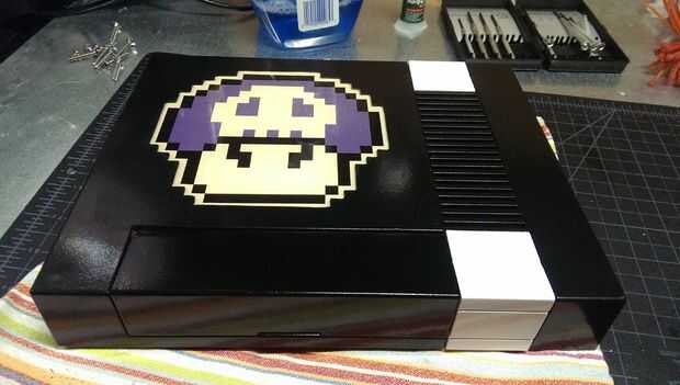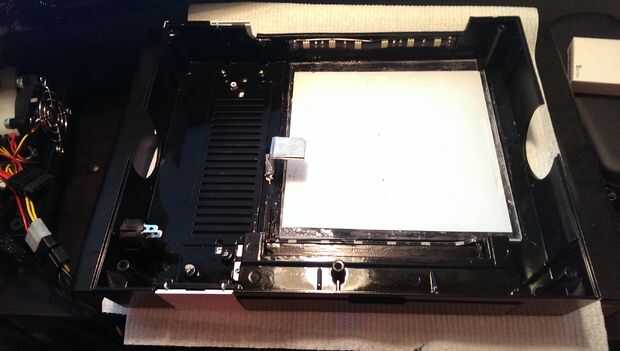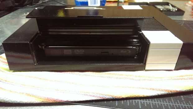 Ahora que la mitad superior es curada su tiempo para montar las piezas de adorno, de LED y la unidad DVD. Hice una placa de la unidad de DVD de algunas láminas de metal junto con un soporte para colgar que pude montar al lado del acrílico (este metal era el protector de calor de los componentes de la NES). Esto permitió la unidad a agradable y apretado.