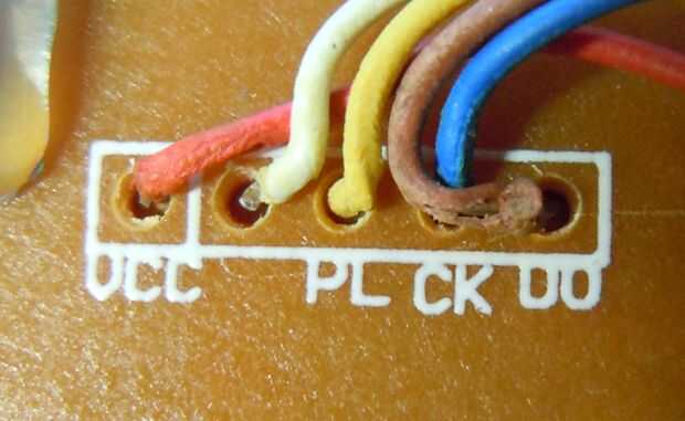 para buscar el GND, + 5, cables de datos hacia fuera, el reloj y cierre. Tenga en cuenta que la foto es de la toma, así que necesitarás al espejo cuando se mira en el cable.