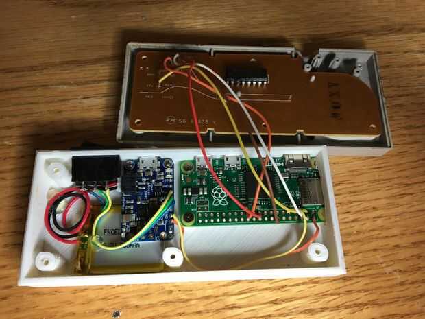 Deslice la batería en su lugar y virar hacia abajo con cinta de doble cara o pegamento caliente. Inserte y atornille el PowerBoost y cero de Pi. Tenga cuidado con la longitud de los tornillos que se utiliza y cuánto usted apriete. El tornillo de abajo de los mensajes puede ser algo frágil. Si se rompe uno, reparar con pegamento caliente o pegamento.