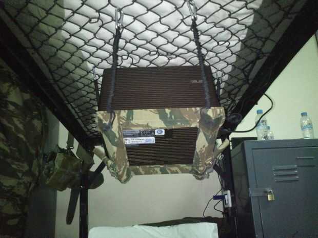 Así surgió una idea sencilla y rápida... Al principio lo colgué con dos cadenas de botas militares hacia abajo de la cama superior, pero era muy simple y que hace pivotar mucho.