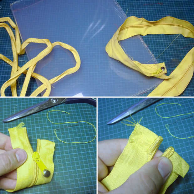 Para terminar su doblez simple de extremos cremallera final 25mm [1"] de los bordes de la cremallera (llamada la cinta de la cremallera), vuelva a sí mismo y cosa algunas puntadas para sujetarlo en su lugar, repita en el otro lado de la cinta para ambos lados se han terminado (ver figura #2 en este paso).