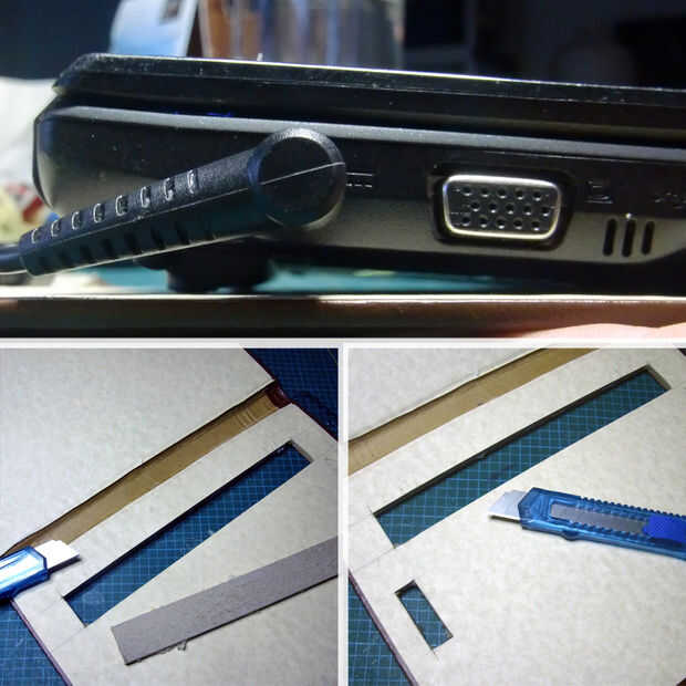 Coloque su ordenador portátil en el libro (ocupándose de la orientación), marque los orificios con un lápiz y luego cortar con un cuchillo de la manía aguda.