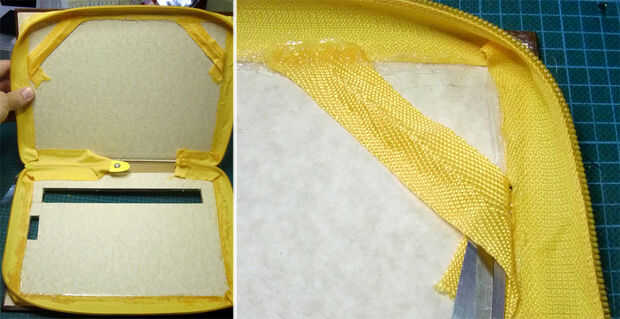 Después de todas las aperturas se han realizado es el momento de instalar la cremallera. La forma más sencilla que encontré fue a pegar hacia abajo cada borde y dejando las esquinas hasta el último.