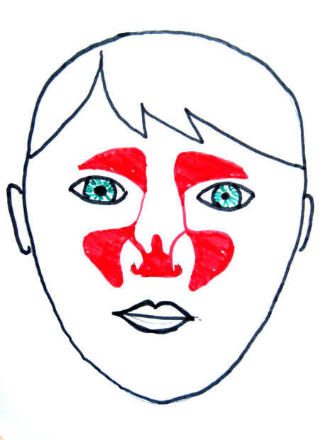 La idea es lavar el agua salada en la concentración adecuada a través de la nariz y los senos paranasales (área roja en el dibujo), por lo que el agua fluye en una fosa nasal y el otro sale. Generalmente, usted tiene que tener un pote neti para esto. Una olla neti se parece a una tetera pequeña (usted puede buscar en internet), y mantenga la boquilla contra una fosa nasal y vierta en el agua.