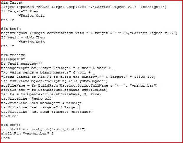 Esta siguiente es la parte que me largo a escribir. Básicamente crea un archivo por lotes y lo llama "~ msngr.bat". Luego escribe los comandos correctos para él para él a iniciar NET send.