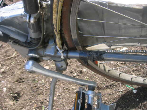 Aquí la defensa se une a la estructura. Había doblado el cable del grano del neumático en un gancho. Sostenía este gancho para el marco de la bici con un lazo de alambre de una hogaza de pan.