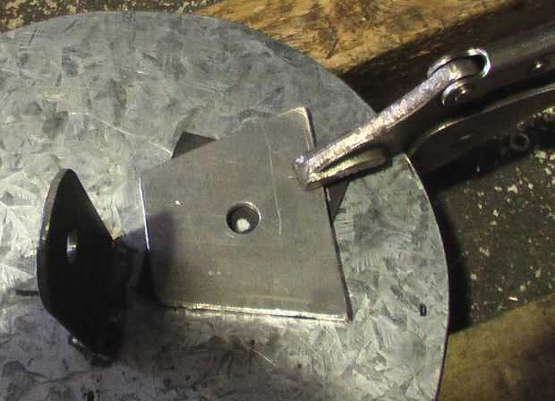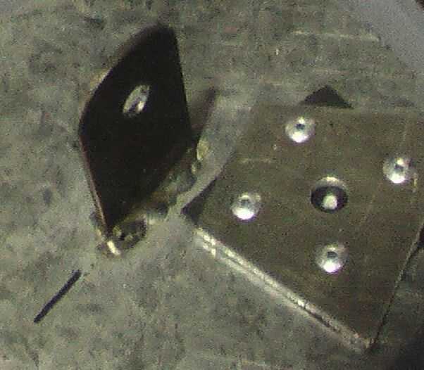 Presionado firmemente keeper (yo usé multigrips) y taladro cuatro remaches aprox. 12mm de los bordes de la placa de portero.
