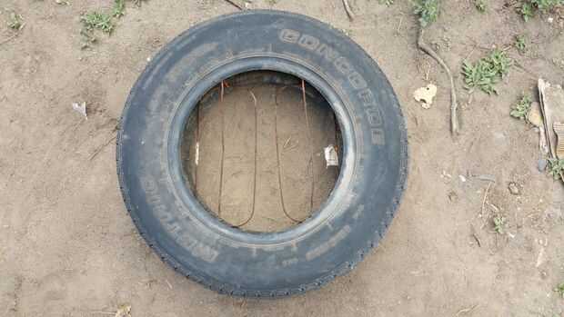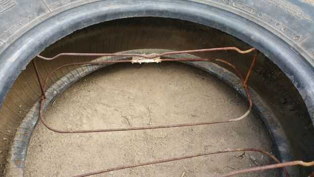 Para preparar un neumático más bajo para el concreto uso 2 soportes de barras de refuerzo (ver foto 1) que se pueden encontrar en la sección de albañilería de ferreterías. Los flancos del neumático son en ángulo hacia adentro lo que dificulta hacer concreto mojado dentro de la llanta. La varilla apoya abierta ayuda difundir los flancos del neumático. También añaden refuerzos metálicos al hormigón. Posición de la varilla apoya para que sostenga el borde (grano) del neumático como se ve en la foto 2.